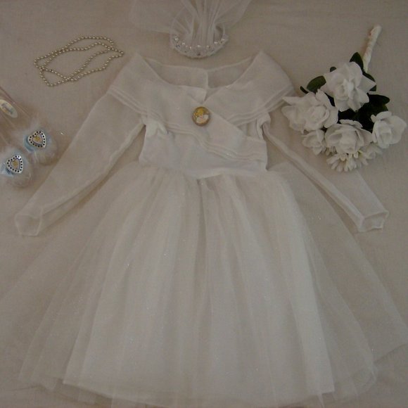 Cinderella is wearing a stunningly gorgeous ivory white wedding dress which is decorated with a collar of printed coloured flowers on the white mesh which covers the.
