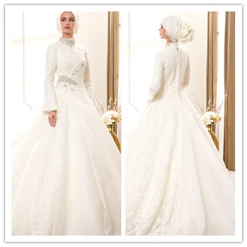 Both wore traditional gowns with elegant lace sleeves. Big, poufy princess dresses are perennial, of course. This is customary in islam.
